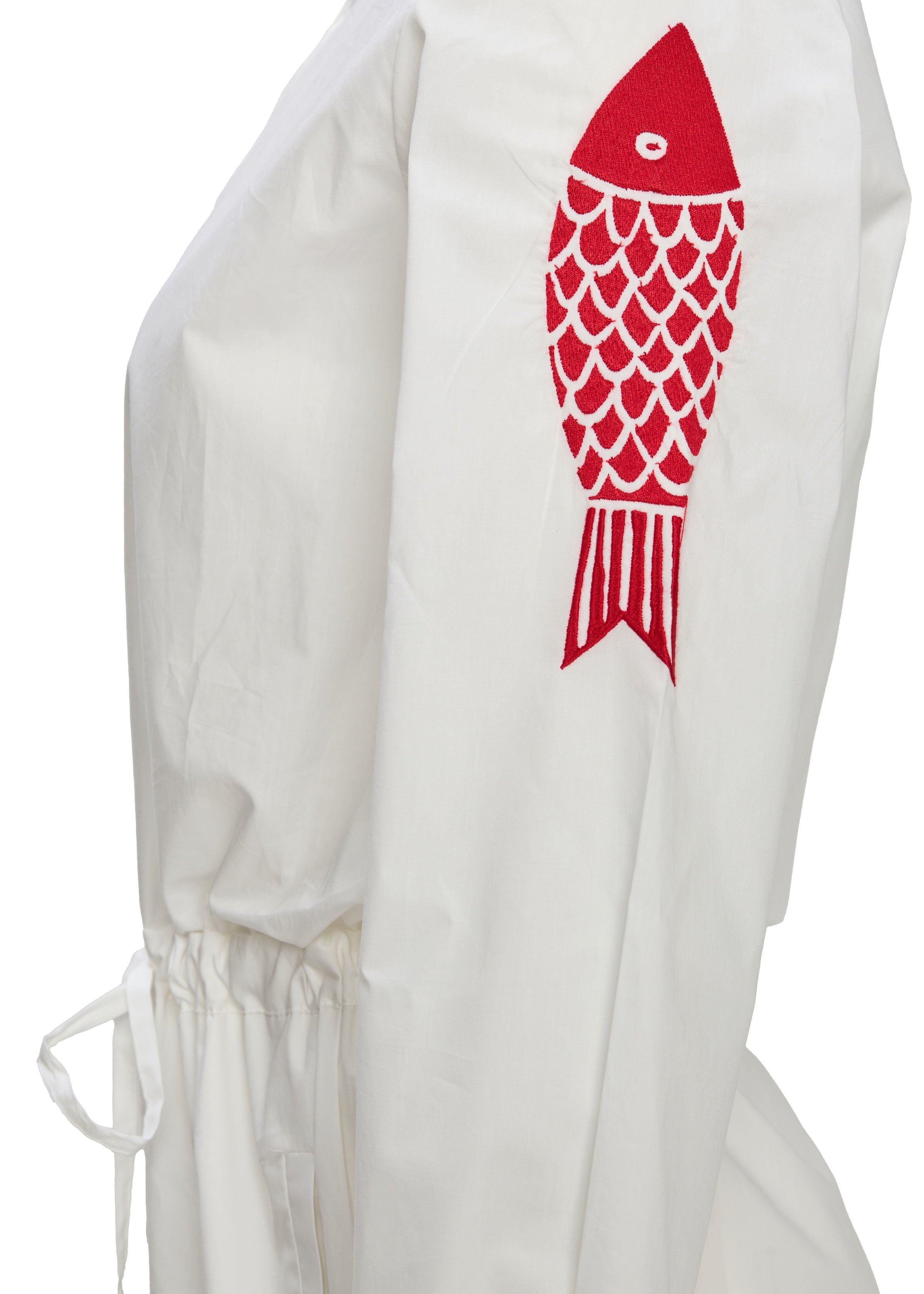 This Aster White Fish Jumpsuit offers a relaxed fit crafted from breathable cotton, ensuring comfort throughout the day. Its distinctive embroidery adds a refined, artisanal touch, making it a versatile piece that combines casual ease with subtle sophistication. Ideal for warm weather, this jumpsuit balances style and comfort effortlessly.