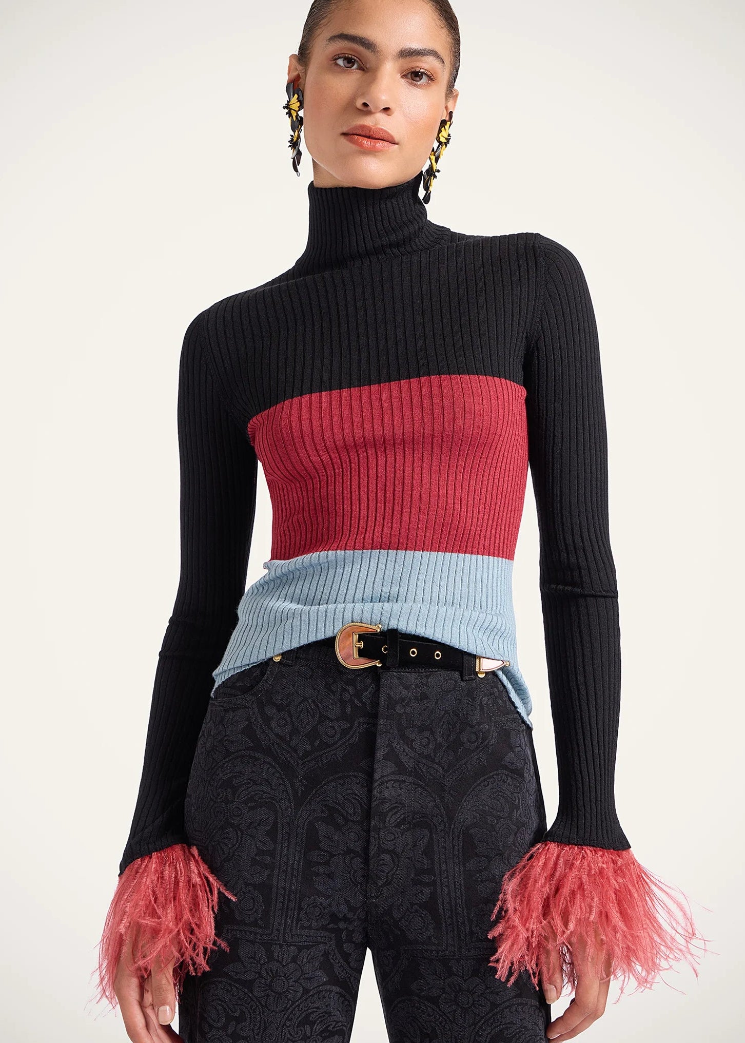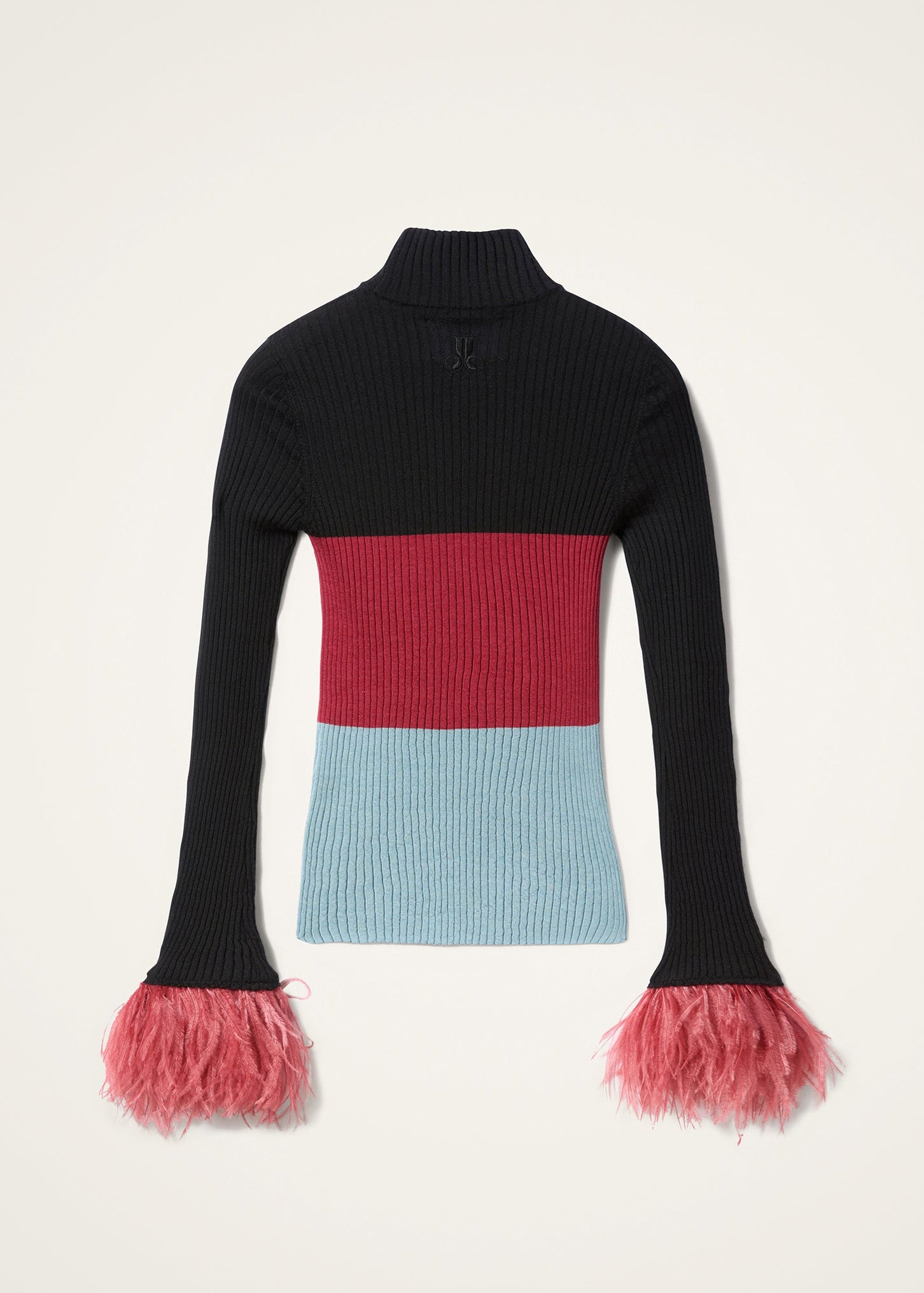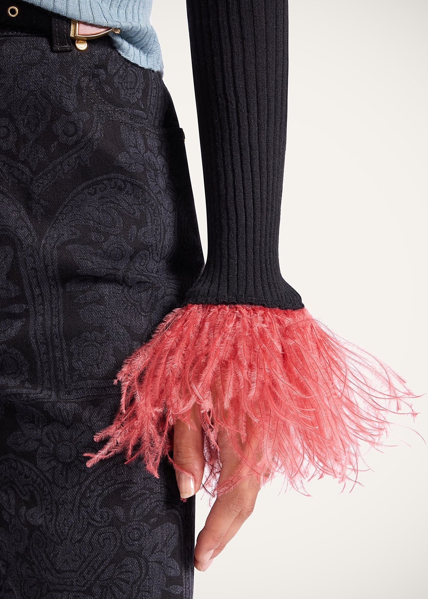 Designed for winter elegance, the Black Multi High Kick Top combines the softness of ribbed silk in multicolor cashmere with striking pink feather details for a unique texture and refined silhouette. It offers versatile sophistication, while the luxurious materials provide warmth and comfort, making it an expert choice for stylish cold-weather layering.