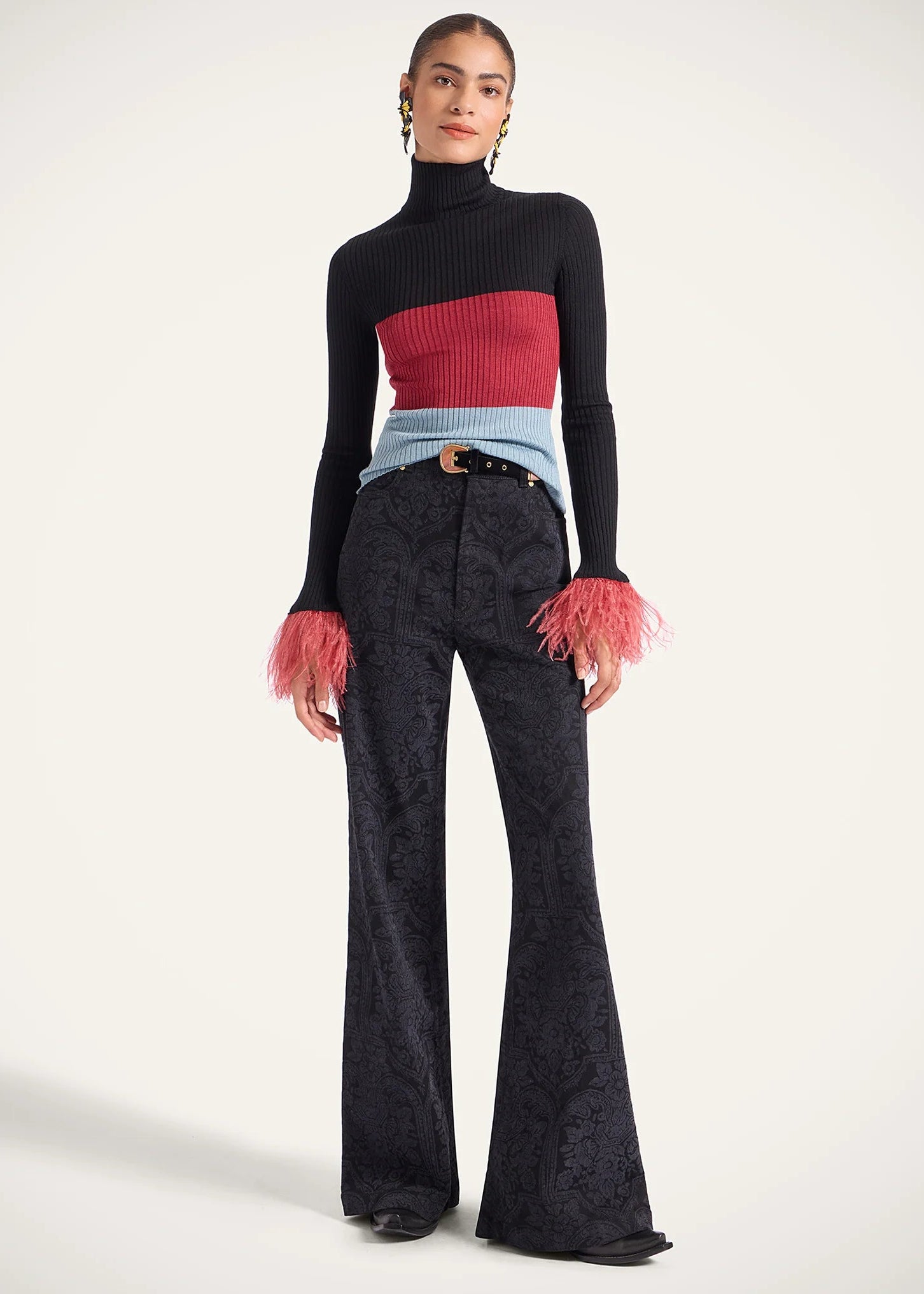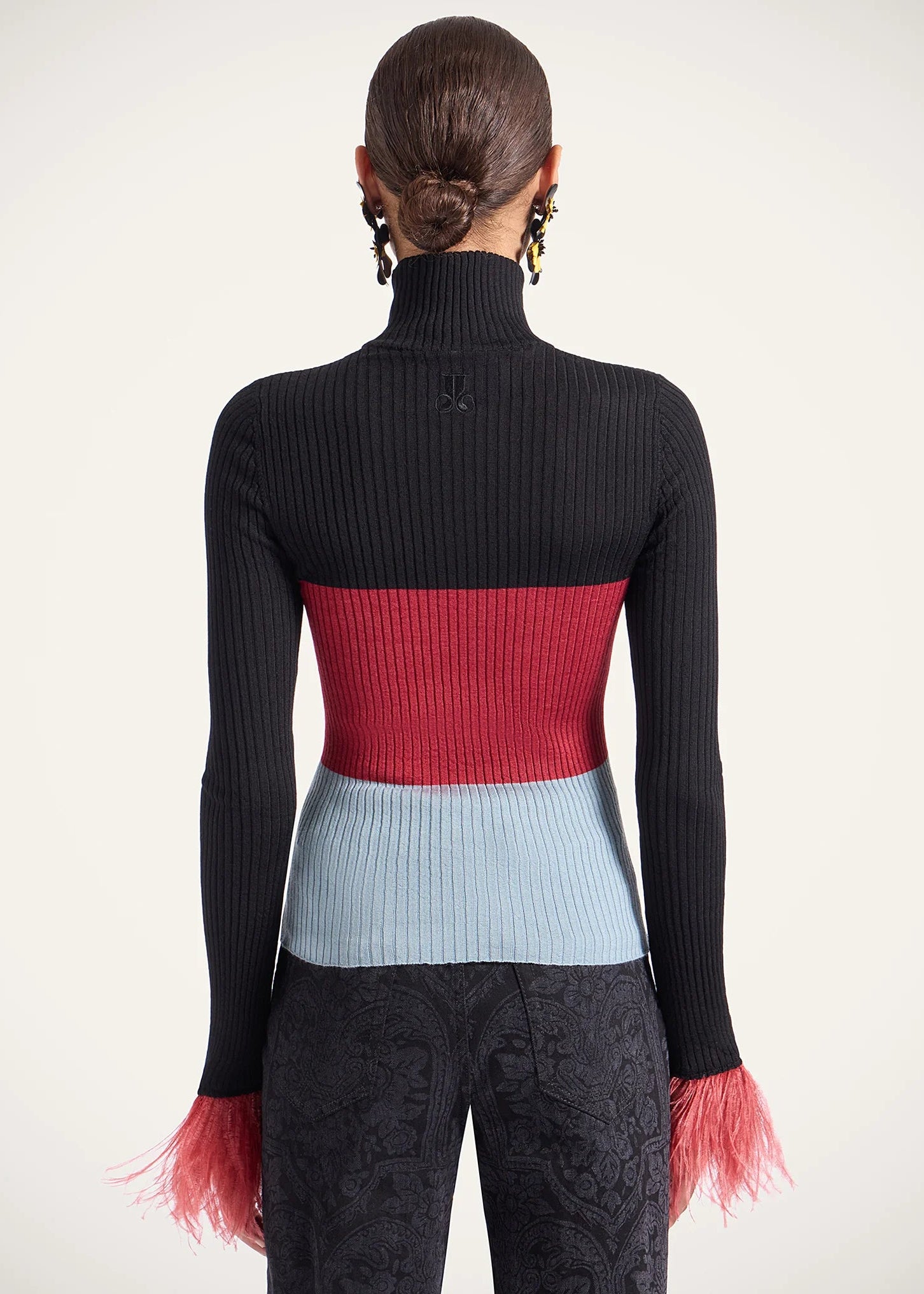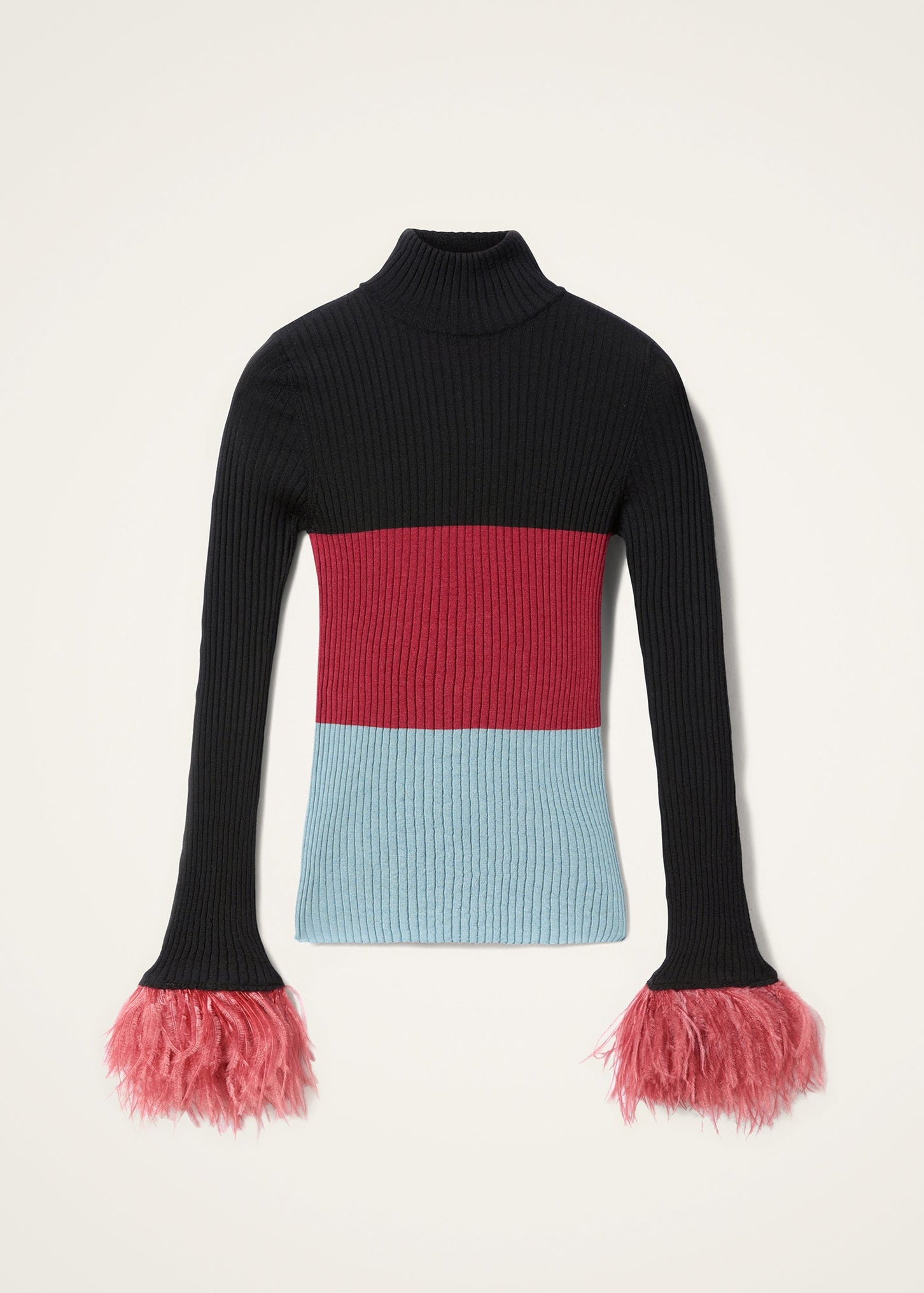 Designed for winter elegance, the Black Multi High Kick Top combines the softness of ribbed silk in multicolor cashmere with striking pink feather details for a unique texture and refined silhouette. It offers versatile sophistication, while the luxurious materials provide warmth and comfort, making it an expert choice for stylish cold-weather layering.