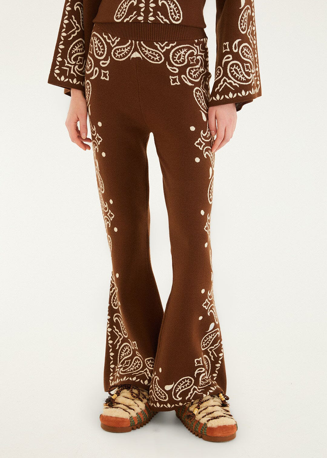 Description: Embrace effortless elegance with these Farm Rio flare pants, featuring a captivating brown and white bohemian paisley knit. Originally designed as a casual piece, their versatile aesthetic transcends occasion—wear them to weekend gatherings or elevate your everyday wardrobe. The flowing silhouette and intricate pattern create a refined, artistic statement that pairs seamlessly with both relaxed and polished styling. Perfect for those who appreciate thoughtful design with understated sophistication.