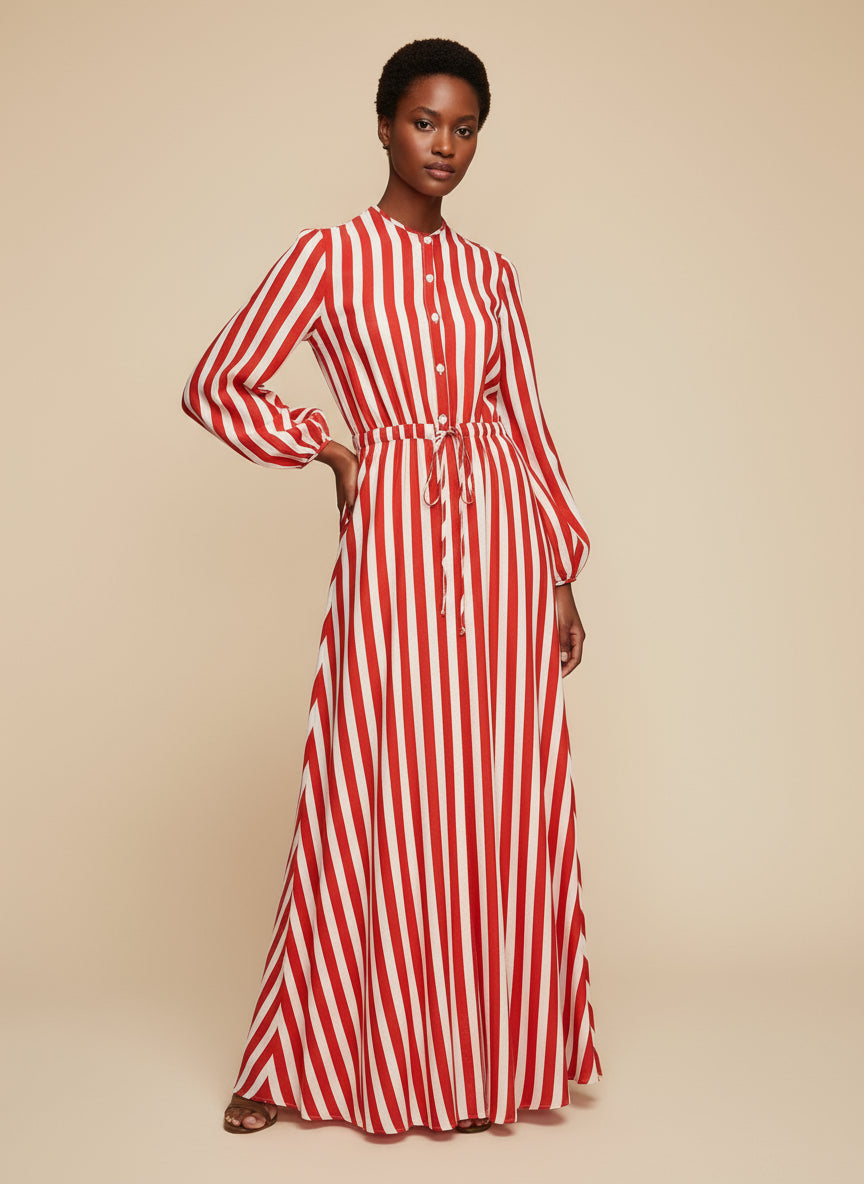 The Clover Linen Stripes Red Dress is a long maxi dress crafted from lightweight linen, ensuring comfort and breathability. Its unique print adds an elegant, artisanal touch, making it a standout piece for warm-weather occasions. Perfect for those seeking a blend of sophistication and ease, this dress offers both style and practicality in one refined design.
