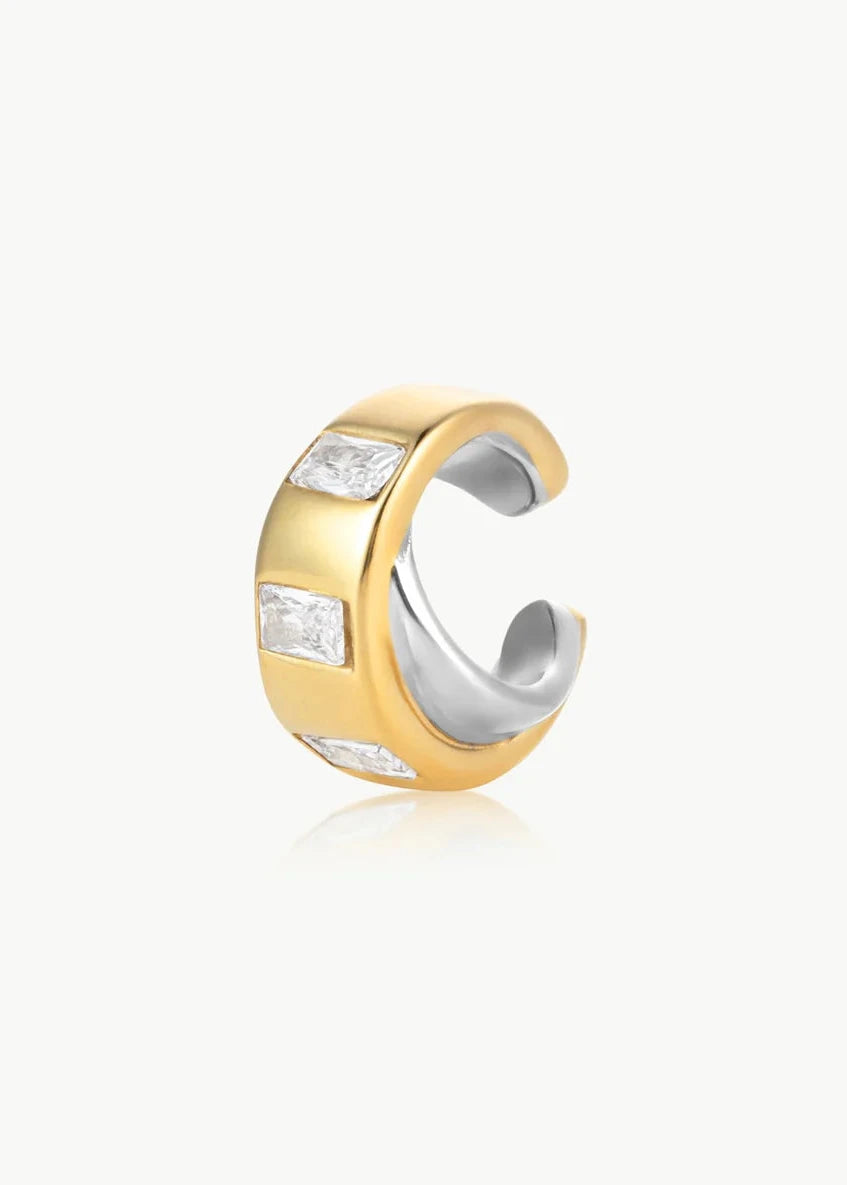 The Draco Ear Cuff combines refined elegance with everyday versatility. Crafted from premium two-tone stainless steel in gold and silver, this sophisticated piece features brilliant white zirconium oxides that catch the light beautifully. Perfect for both men and women, this unisex accessory makes a bold yet understated statement, seamlessly transitioning from professional settings to casual occasions.