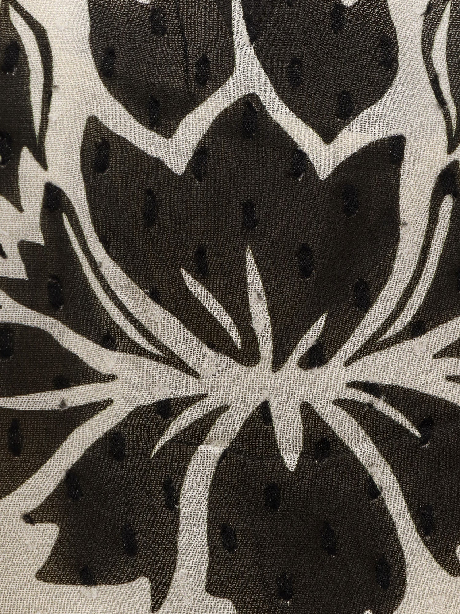 This elegant maxi dress features a high neckline with delicate ruffle trim and billowy long sleeves gathered at intricately smocked cuffs. Crafted from cream fabric adorned with bold black arabesque florals, it offers a flowing silhouette that moves gracefully. A playful rope belt cinches the waist, adding definition and a refined touch to the overall design. Ideal for sophisticated occasions, this dress balances timeless details with dynamic patterning for a standout look.