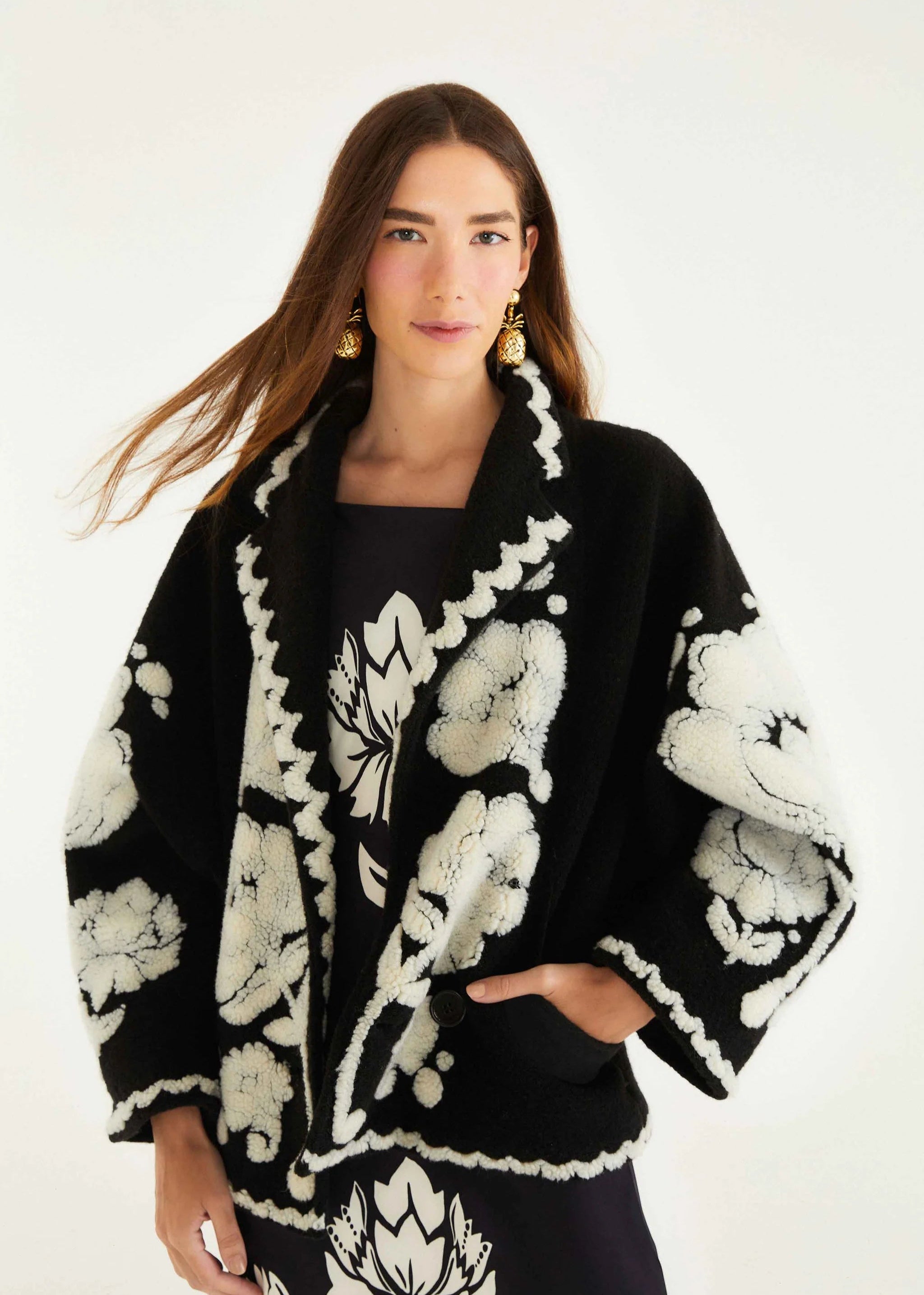 The Floral Arabesque Fleece Coat combines luxurious plush fleece with a striking black base embellished by bold white florals, creating a refined yet lively design. Its relaxed silhouette and soft collar neckline ensure exceptional comfort, while the delicate scalloped trim adds a subtle handcrafted elegance. Ideal for cooler days, this coat offers both warmth and distinctive style with expert craftsmanship.