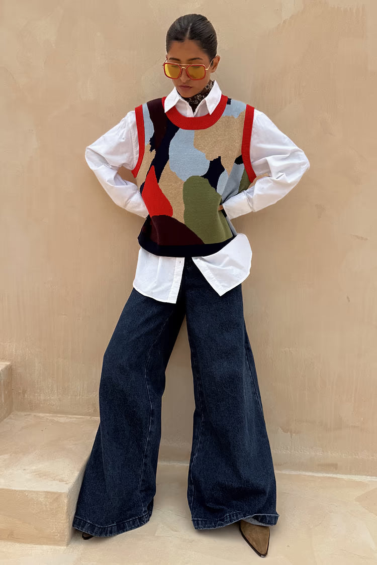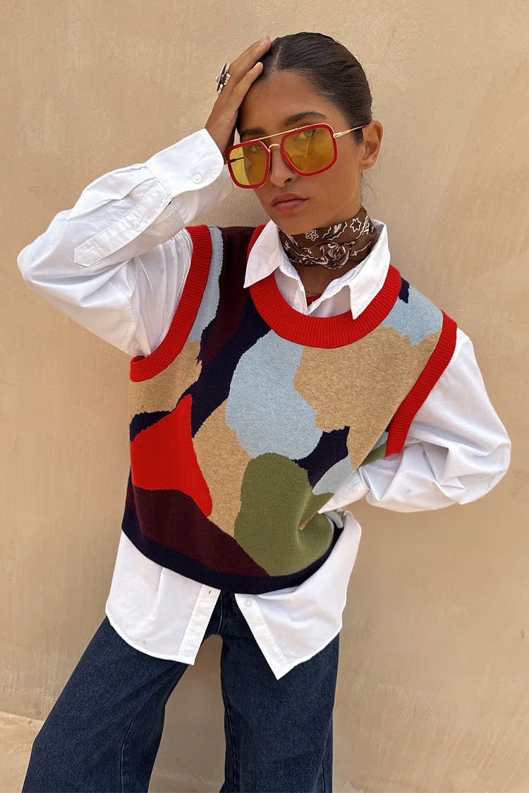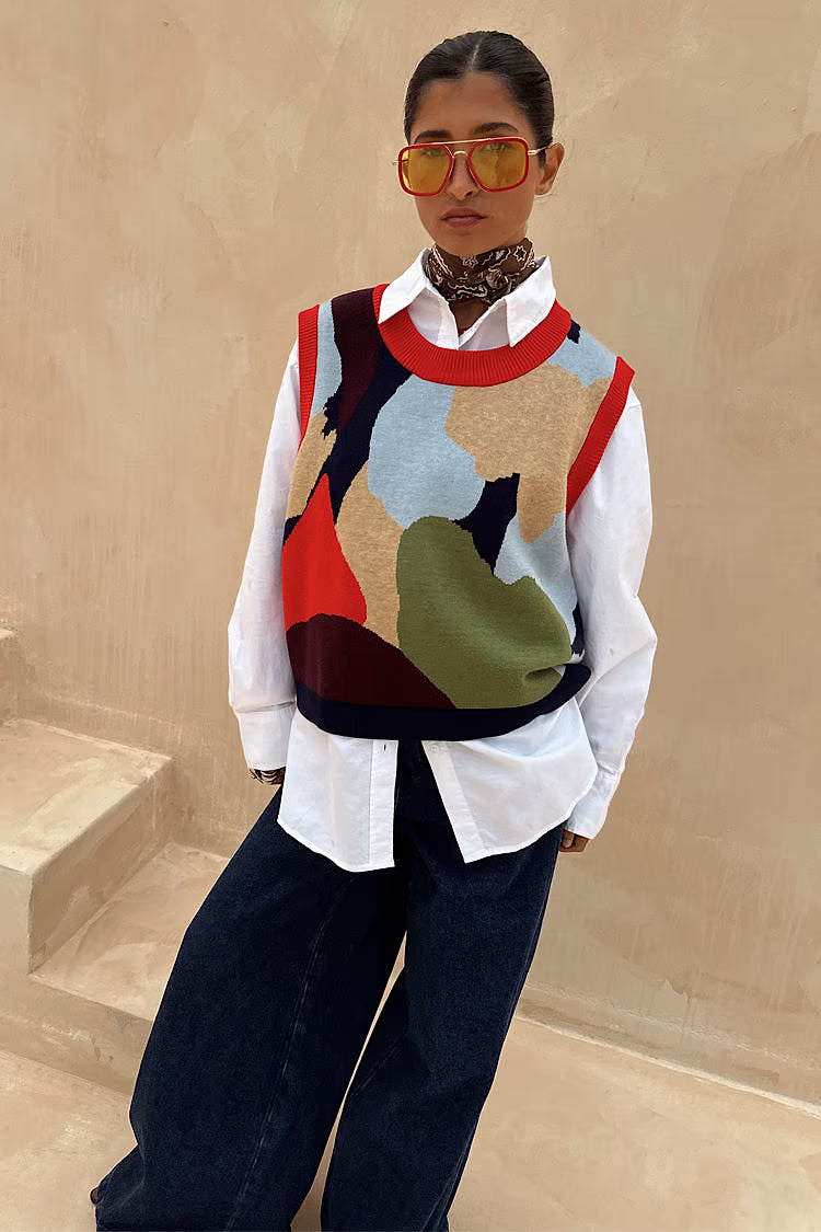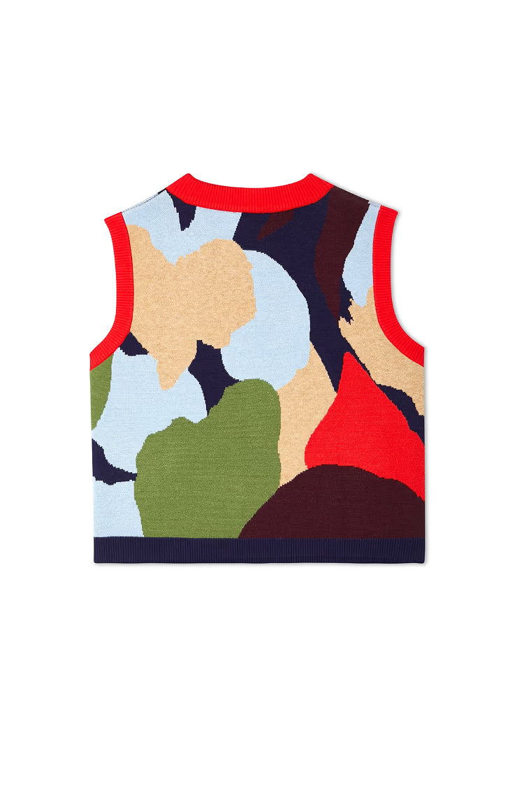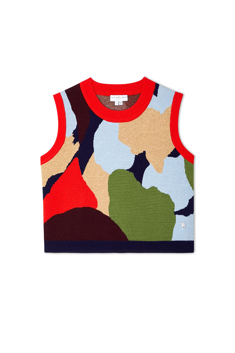 Description: Add a splash of color with this playful multi-colored abstract print top! A fresh twist on our signature artist print, it's made from soft knit fabric featuring a fun tasselled hem and bold red trim along the neckline for extra texture. Style it with the matching cardigan and skirt for a coordinated look or layer it over a shirt with scallop jeans for a casual, cheerful outfit.