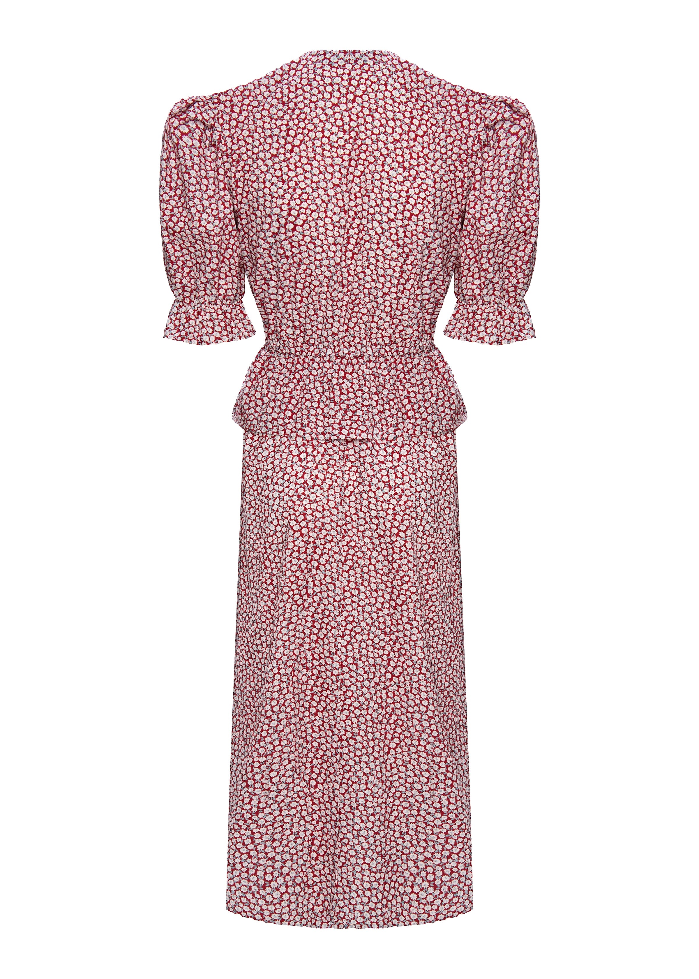 The Milena Liberty Red Flower Dress is a ruched midi dress designed for effortless summer style. Its vibrant print brings a fresh, lively touch, while the ruched detailing enhances the silhouette with subtle texture. Lightweight and flattering, this dress is perfect for warm days when you want to combine comfort with a bold, elegant look.