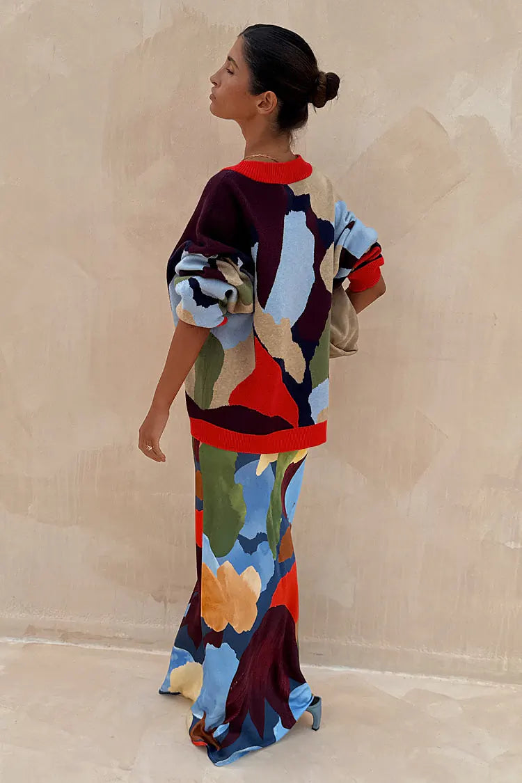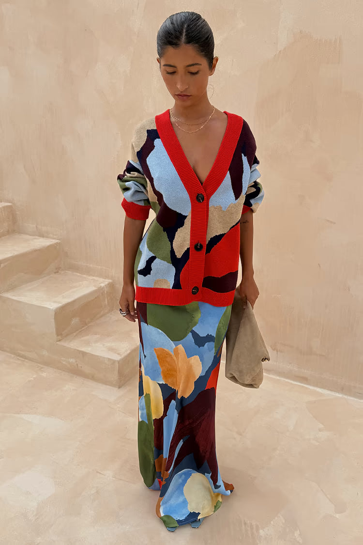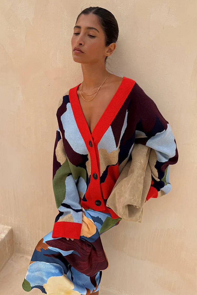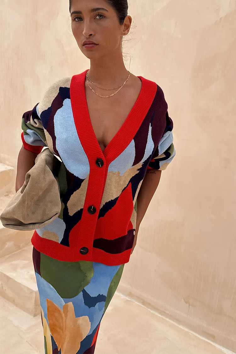 This lively, reimagined take on our signature artist print brings a fun splash of color to your wardrobe! The soft fabric feels cozy, while the red trim along the neckline, cuffs, and pockets adds a playful texture to the clean design. Pair it with the matching Dorris skirt for an easy, stylish set or throw it over a tank and jeans for a casual, cheerful look.