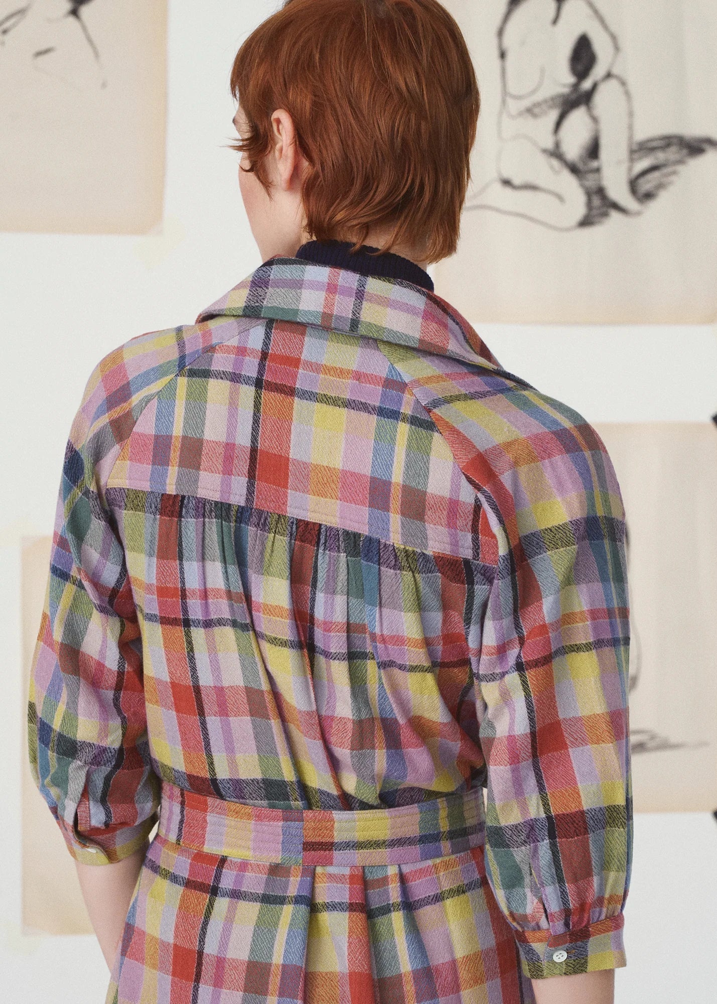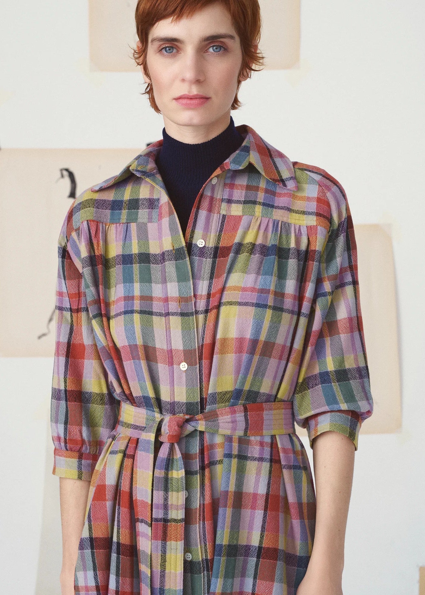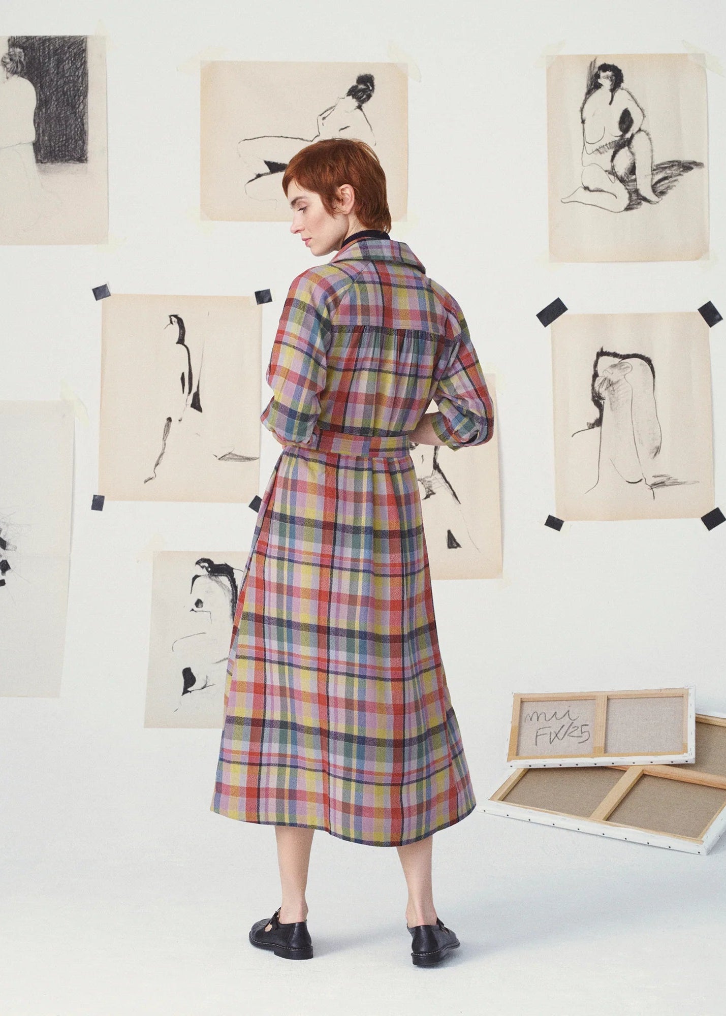 The Niki Dress Abstraction in Pastel combines artisanal heritage with contemporary elegance. Handwoven on a wooden loom from pure cotton, its checkered pattern adds a subtle graphic depth. Designed for winter, it offers warmth and sophistication with a belted waist, two practical pockets, and a full-length button placket, perfect for polished seasonal styling.