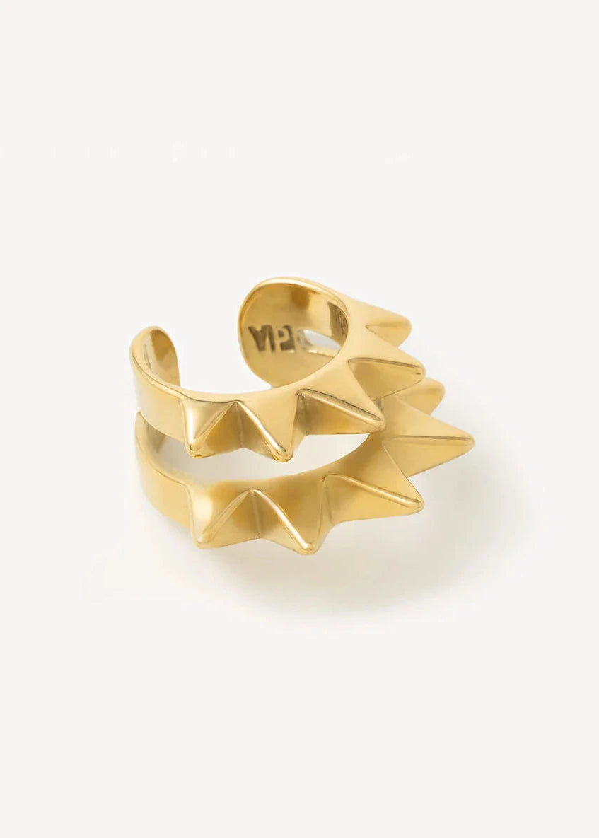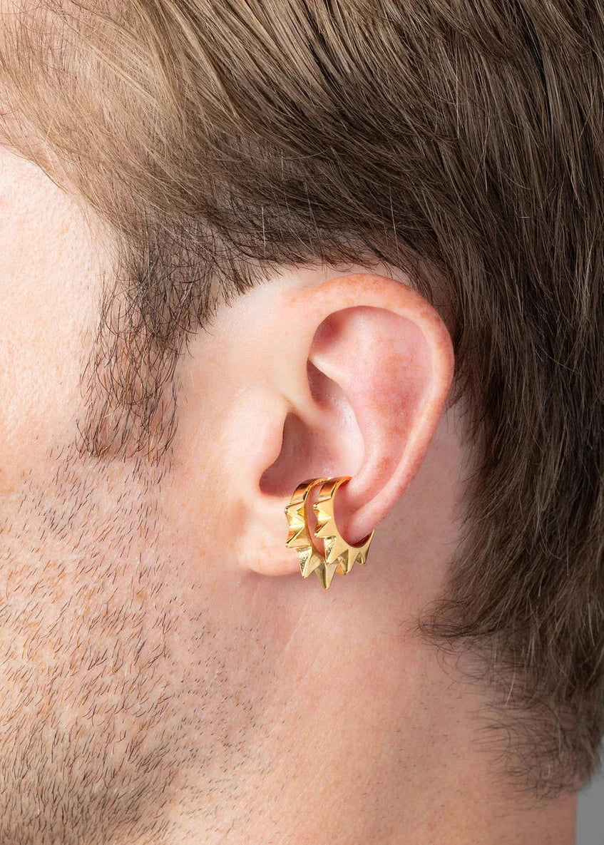 The Pike Double Gold Ear Cuff makes a bold statement with its dual-band design featuring striking gold-plated stainless steel spikes. The geometric spike detailing adds an edgy sophistication, transforming traditional ear jewelry into a contemporary art piece. Gold-plating ensures a lustrous finish that commands attention while maintaining refined elegance. This distinctive design bridges the gap between avant-garde aesthetics and wearable luxury, appealing to those who embrace unconventional style.