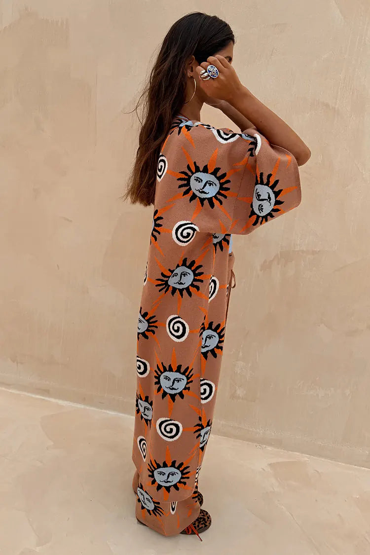 Description: This slightly oversized cardigan with dropped shoulders and wide sleeves is cozy and ideal for those chilly season changes. Decorated with hand-painted sun and swirl designs inspired by Mediterranean art. Wear it with the matching trousers for a stylish co-ord or layer it over your favorite outfit for extra warmth and flair.