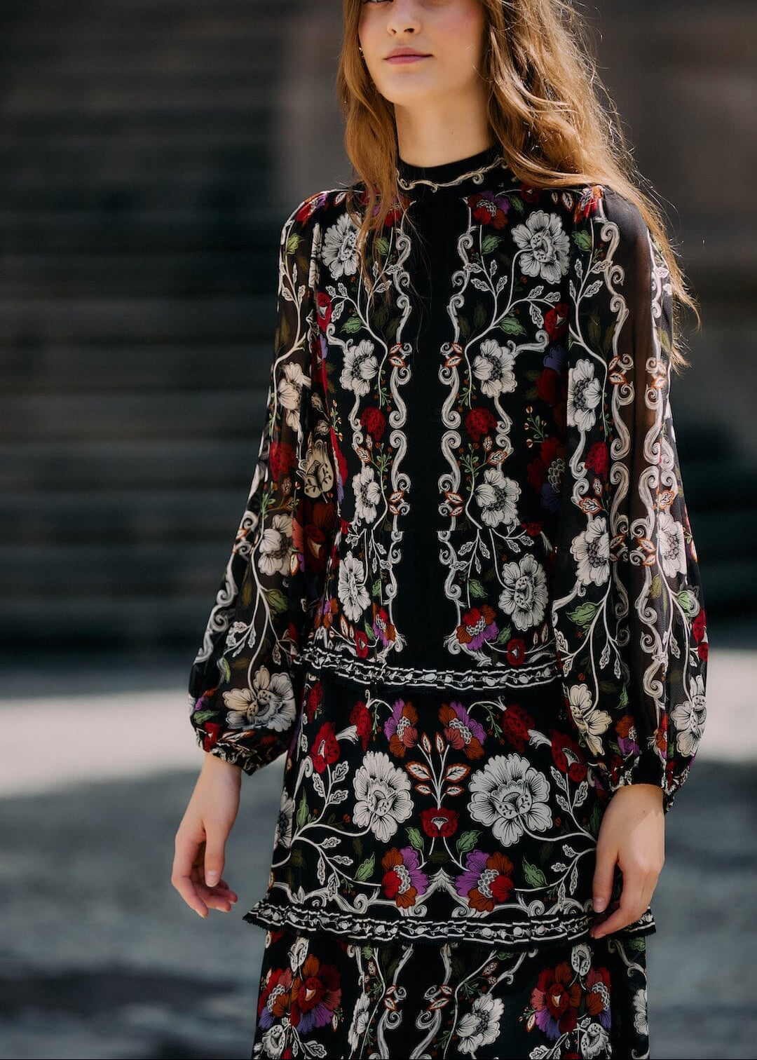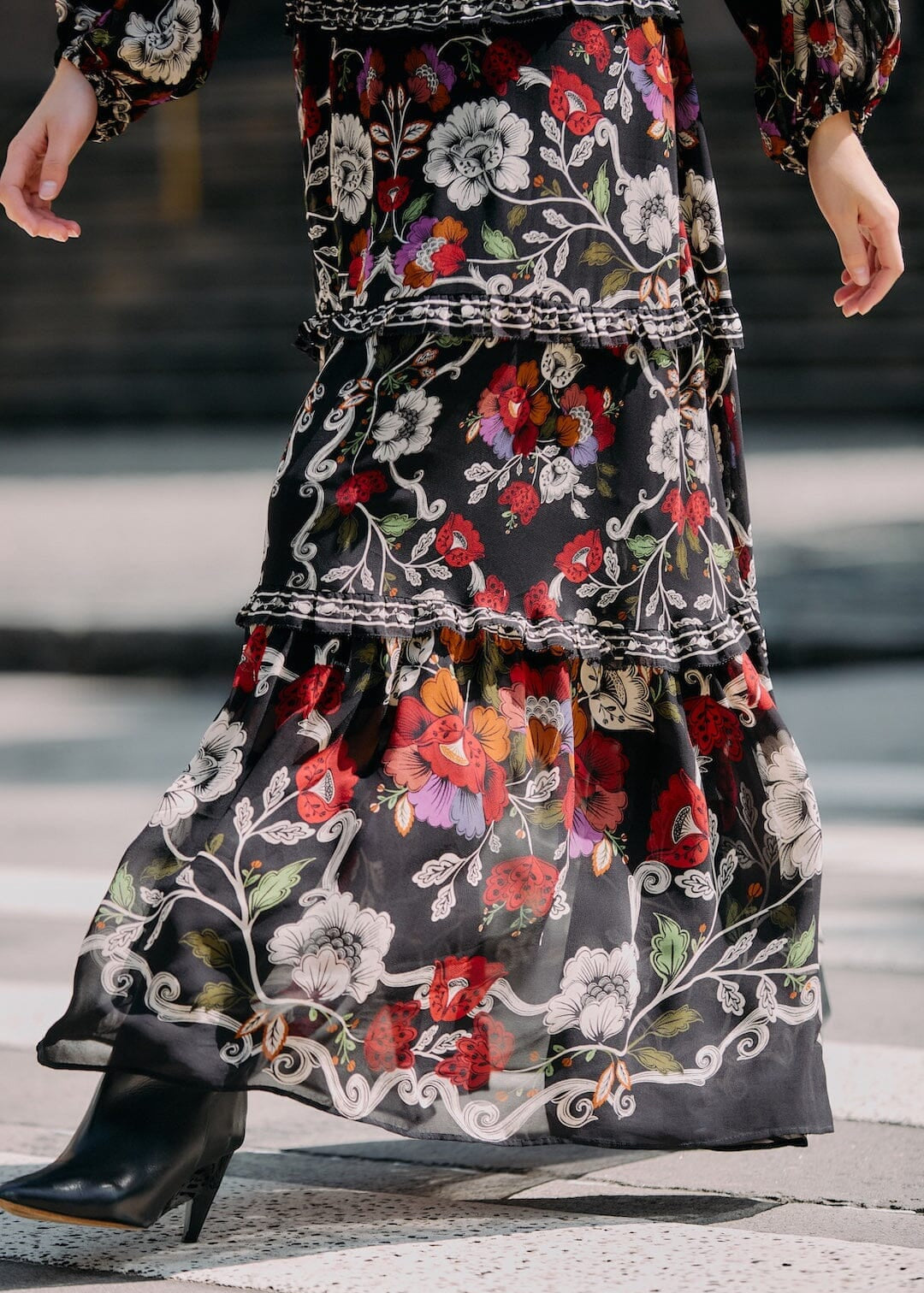 Description: Embrace warmth and playfulness in every step with the Black Rococo Flowers Ruffled Maxi Dress by FARM Rio. Its vibrant floral patterns against a deep black canvas create a striking contrast, while the high neckline and soft ruffles add elegance and movement. Perfect for joyful and colorful celebrations!